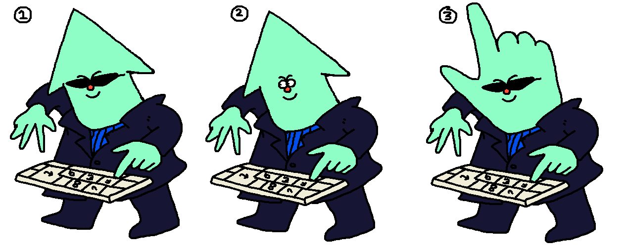 03:When they stand over a spot that can be "hacked into", their cursor shaped head turns into a pointing finger. They don't notice this change, so it's up to you, the player, to help them.