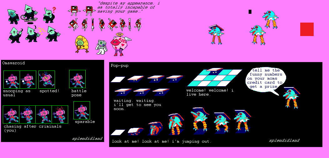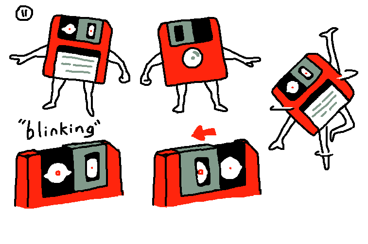 11:Diskette, spins in place until talked to. "despite my looks, i am totally unable to save your progress"