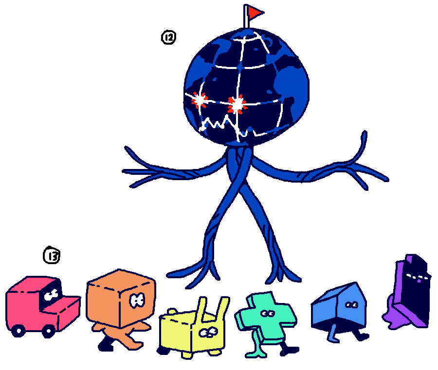 13:"Data", little icon like creatures who march onwards with unknown purpose. they take part in the festival.