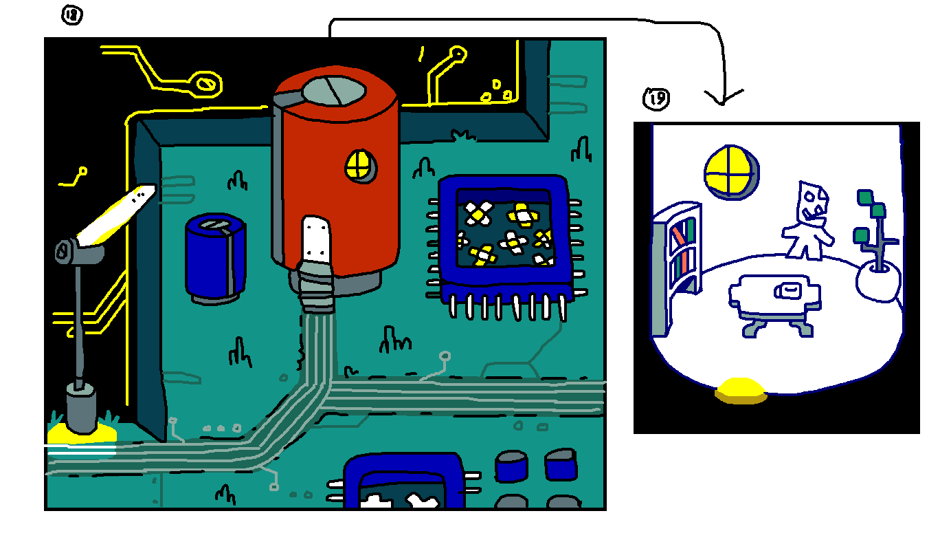 This is one of the first images I drew while brainstorming concepts for the chapter. From the beginning, I knew I wanted to have enemies with electric sockets for faces...